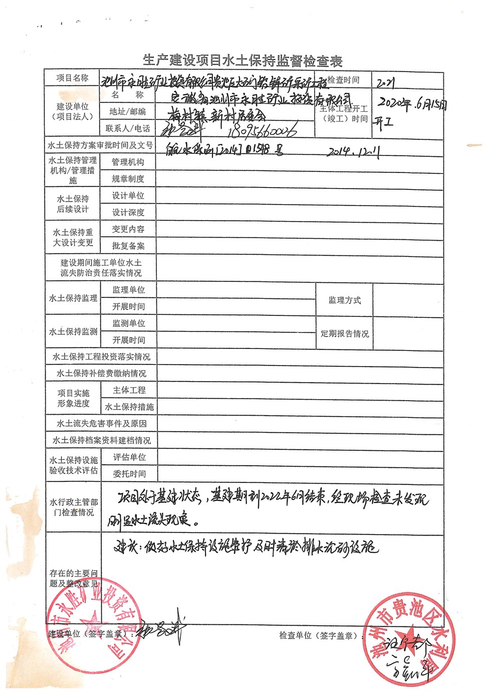 名稱: 永勝礦業(yè)鉛鋅礦采礦工程水土保持監(jiān)督檢查表 文號(hào):