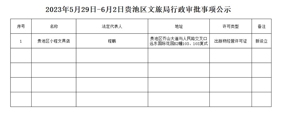名稱: 2023年5月29日-6月2日貴池區(qū)文旅局行政審批事項(xiàng)公示 文號(hào):
