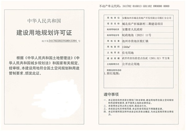 | 名稱: | 建設(shè)用地規(guī)劃許可證(城北房產(chǎn)祈福新村二期建設(shè)項(xiàng)目) | 文號(hào): | 無(wú) |
