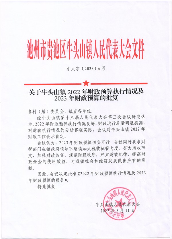 關于牛頭山鎮(zhèn)2022年財政預算執(zhí)行情況及2023年財政預算的批復