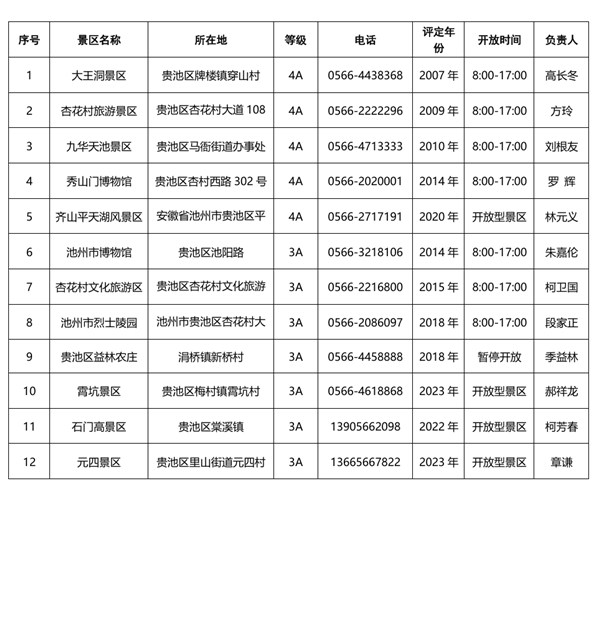 貴池區(qū)A級(jí)景區(qū)匯總表