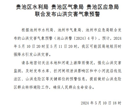 【預(yù)警信息】貴池區(qū)山洪災(zāi)害氣象預(yù)警信息(貴山洪警〔2024〕2號(hào))