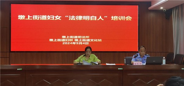 為規(guī)范推進(jìn)鄉(xiāng)村“法律明白人”培養(yǎng)工程,培養(yǎng)一支群眾身邊的普法依法治理工作隊伍,墩上司法所面向墩上所有村(社區(qū))婦聯(lián)干部、巾幗志愿者,組織開展培育“巾幗法律明白人”的普法專題培訓(xùn),街道及村居婦聯(lián)主席、婦聯(lián)執(zhí)委、其他婦女干部、巾幗法律明白人等40余人參加培訓(xùn)。
