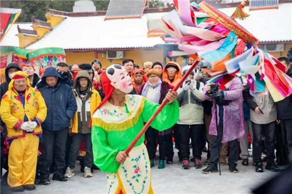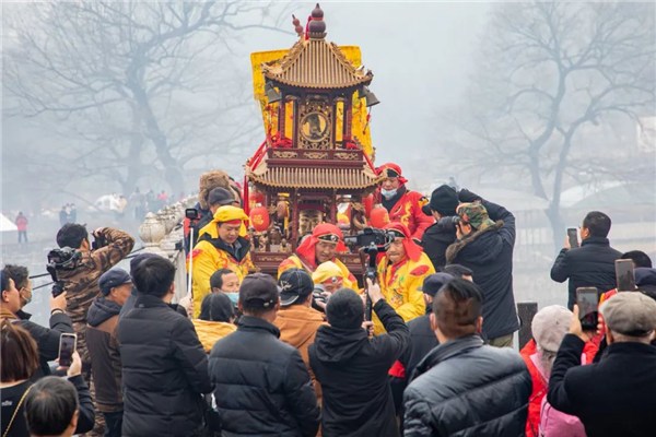 廟會現(xiàn)場,各社的龍燈、獅舞、竹馬、高蹺盡獻技藝,其時,鼓樂喧天,人聲鼎沸,旗鑼傘銃,蔚為壯觀,由“傘孩兒”舞傘領(lǐng)頭,年首喊“青山廟段”,抬龍亭之人聞聲,跟著節(jié)奏將龍亭一上一下抖動,似點頭狀。人們爭先恐后,紛紛涌向儺戲龍亭,舉起手機、相機記錄下這個獨具地域特色的文化瞬間。