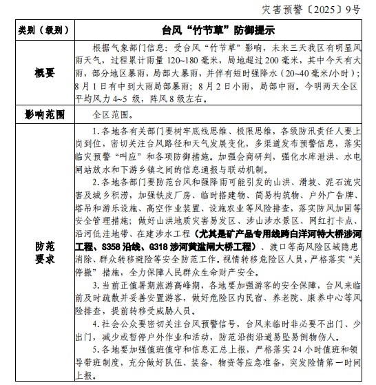 名稱: 貴池區(qū)氣象災(zāi)害防御提示(災(zāi)害預(yù)警〔2025〕9號 )臺風(fēng)“竹節(jié)草”防御提示 文號: