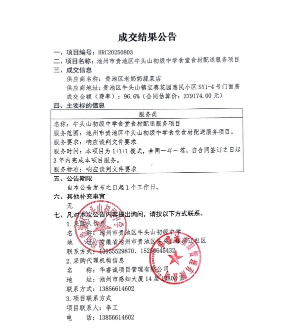 牛頭山初級(jí)中學(xué)食材招標(biāo)中標(biāo)結(jié)果公示