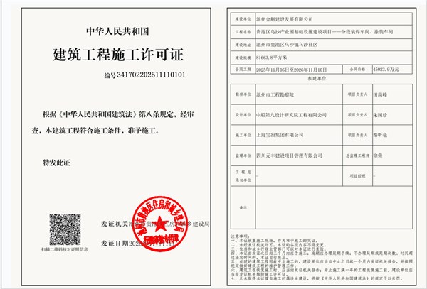 貴池區(qū)烏沙產業(yè)園基礎設施建設項目——分段裝焊車間、涂裝車間 《建筑工程施工許可證》批后公布